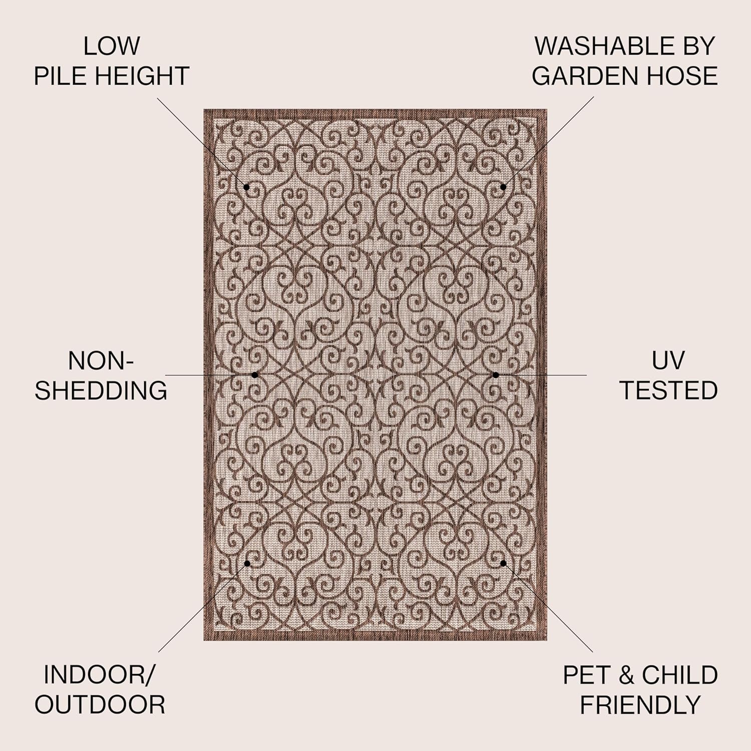 - STAIN-RESISTANT AND PET-FRIENDLY: This rug is made from synthetic fibers that resist UV fading; The pet-friendly low-pile construction won’t accumulate dirt, and spills clean up easily; It’s been machine-woven so the rug fibers will stay put