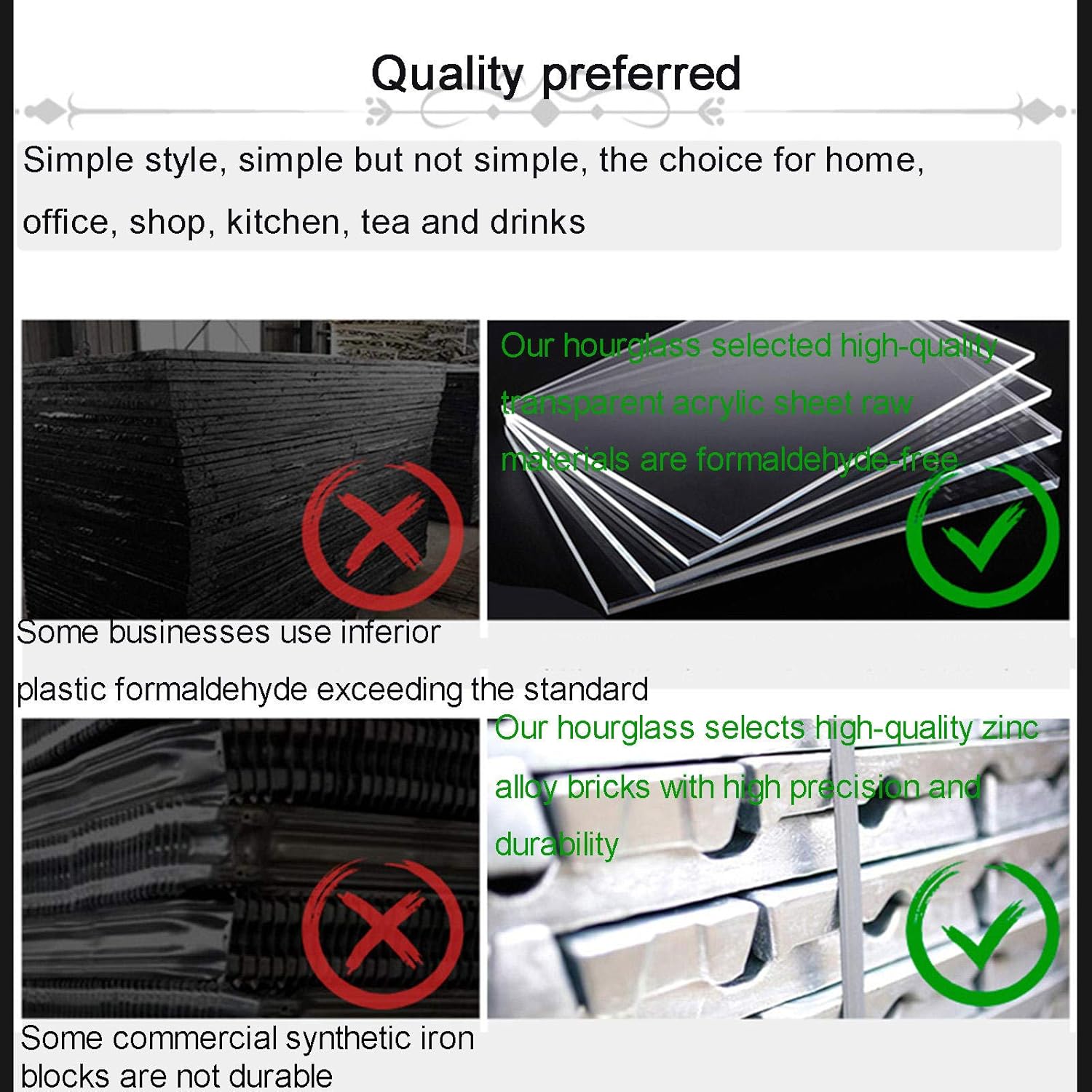 - [Excellent quality] The hourglass timer is made of high-quality metal + acrylic plexiglass, with classic embossed craftsmanship, the texture is natural and lifelike, retro and advanced, the classic hourglass timer will bring an elegant feeling to your office and home, it will definitely be Let your guests be amazed.