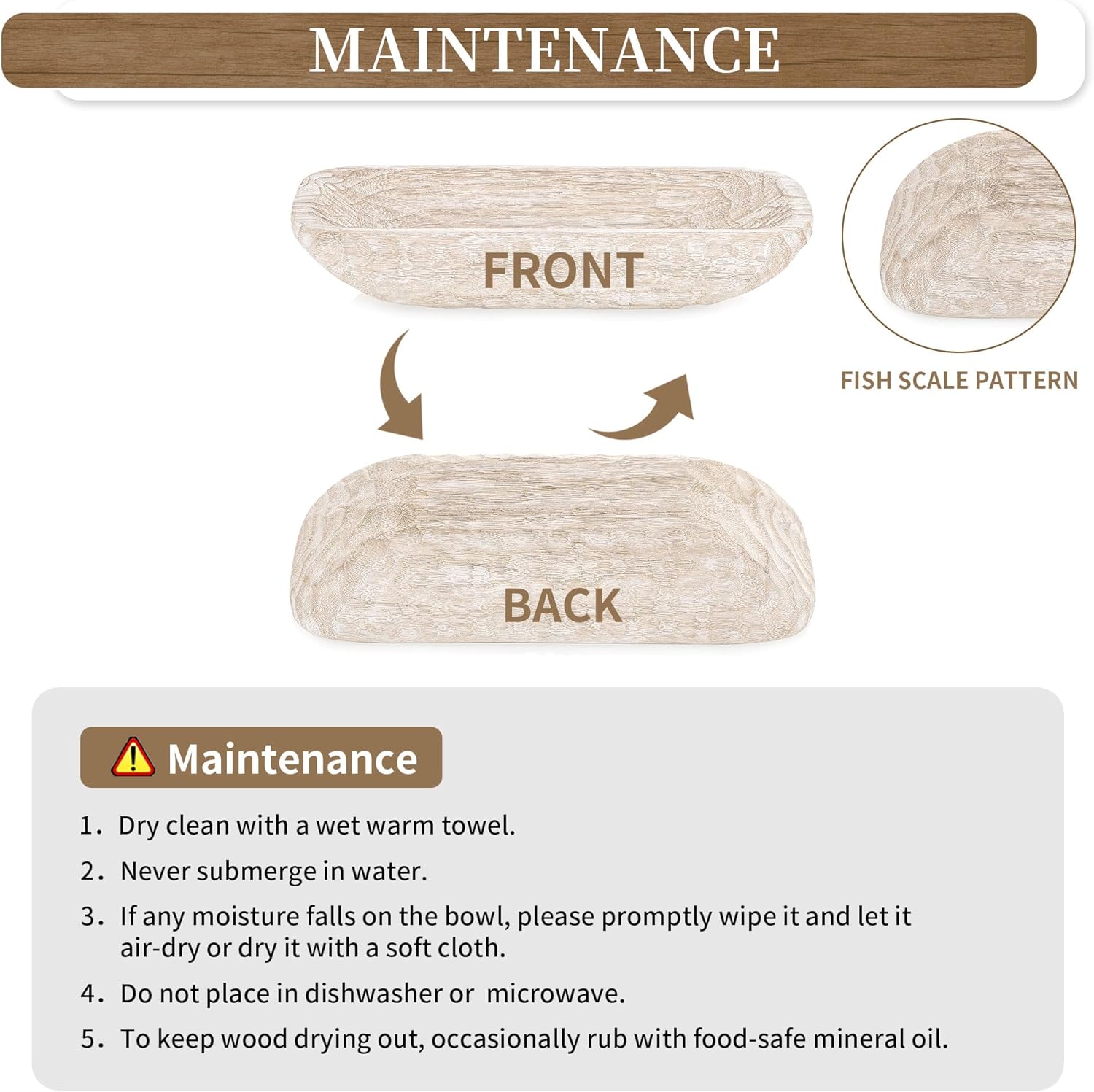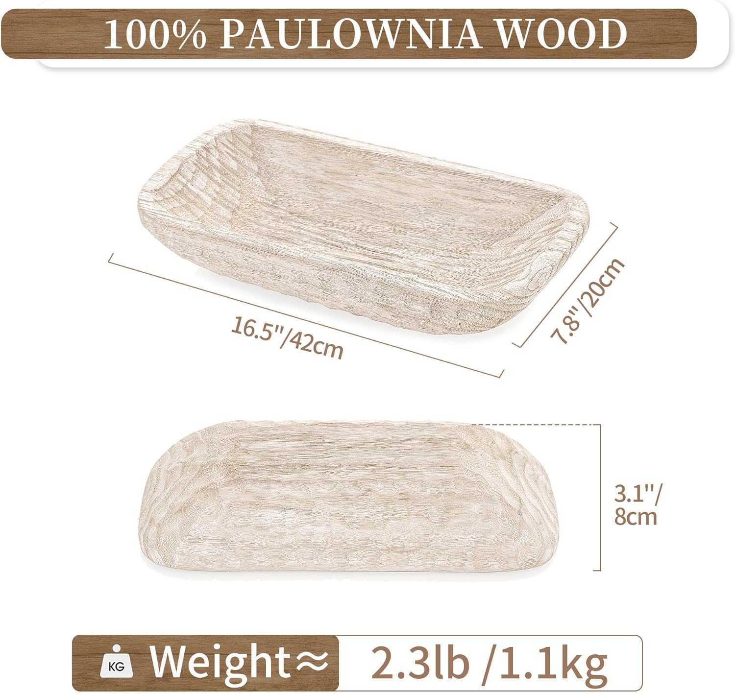 - Size: The long wood bowls decorative measures 16.5" x 7.8" x 3.1"approximately. As you know, all our dough bowls for decor are handmade, so there might be chances of small variations in the sizes of +/- 0.5 inch.