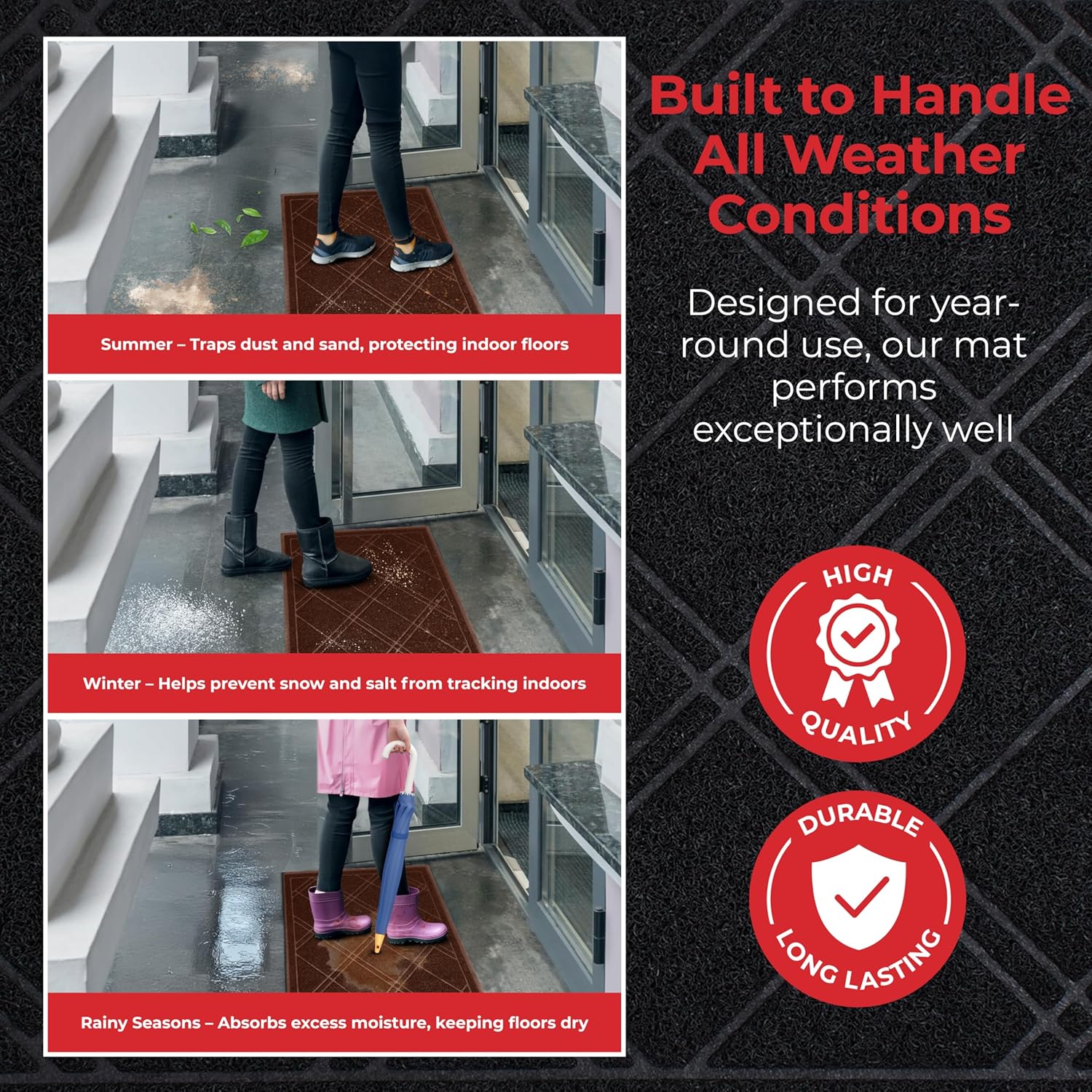 - WEATHERPROOF SURFACE: These mats are waterproof- and moisture-resistant. They are perfect for both inside or outside door mats.
