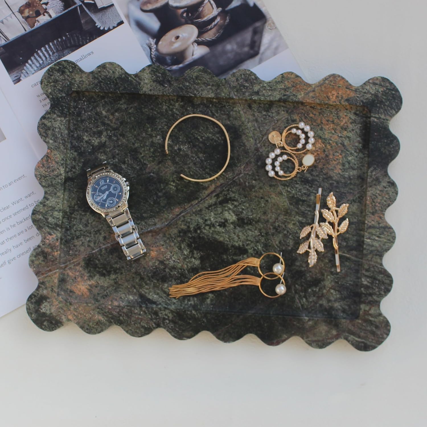 Natural Luxury Scalloped Marble Tray 10.8"x8", Rectangle Vanity Tray for Bathroom Kitchen Counter, Decorative Tray for Dresser Home Decor - Rainforest Green