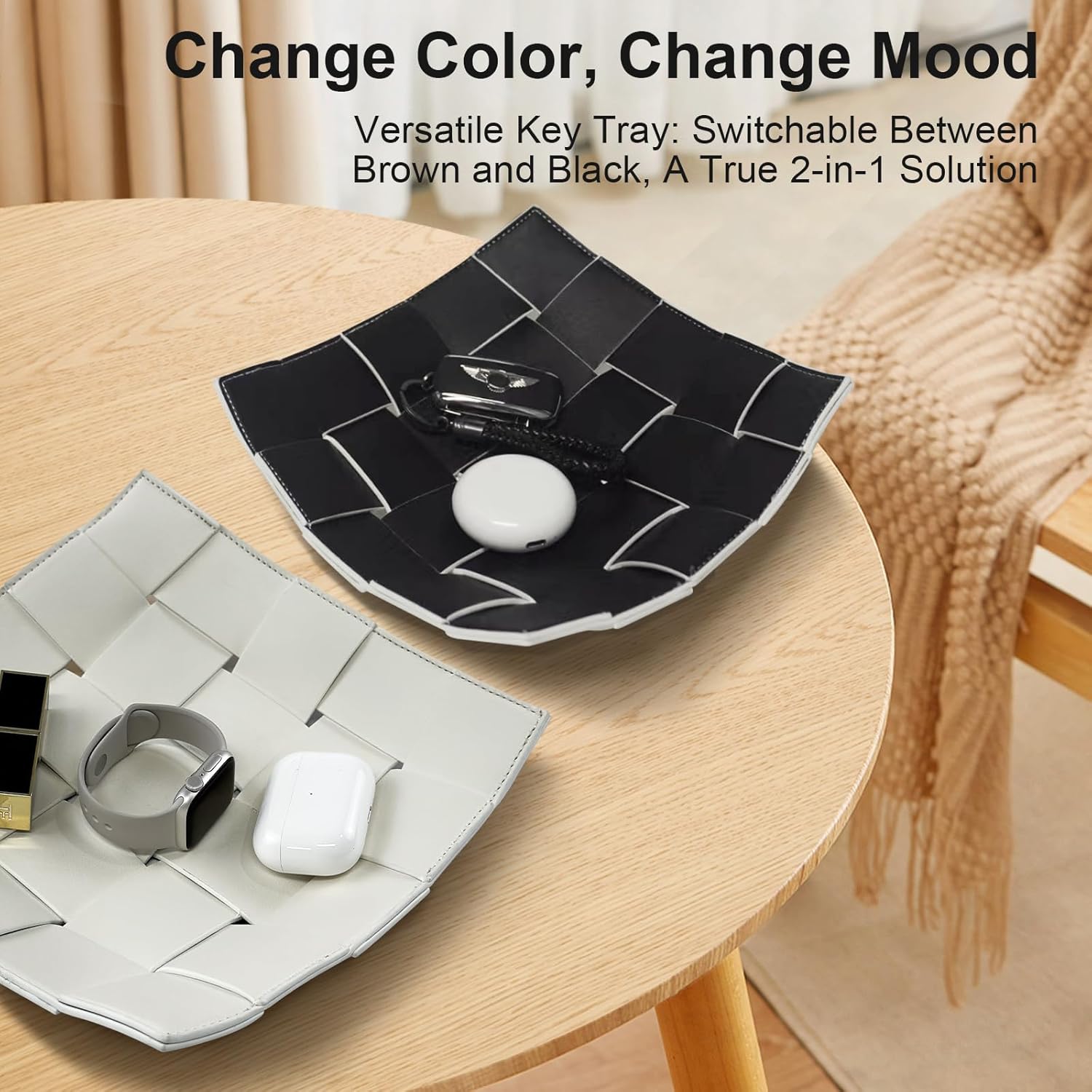 - STYLISH REVERSIBLE DESIGN - The PU leather valet tray utilizes a square woven with a delicate and elegant double-sided design, it can be easily reversed between black and white, making it like a 2-in-1. Storage tray suitable for any style of home scene, create an aesthetic atmosphere in your home.