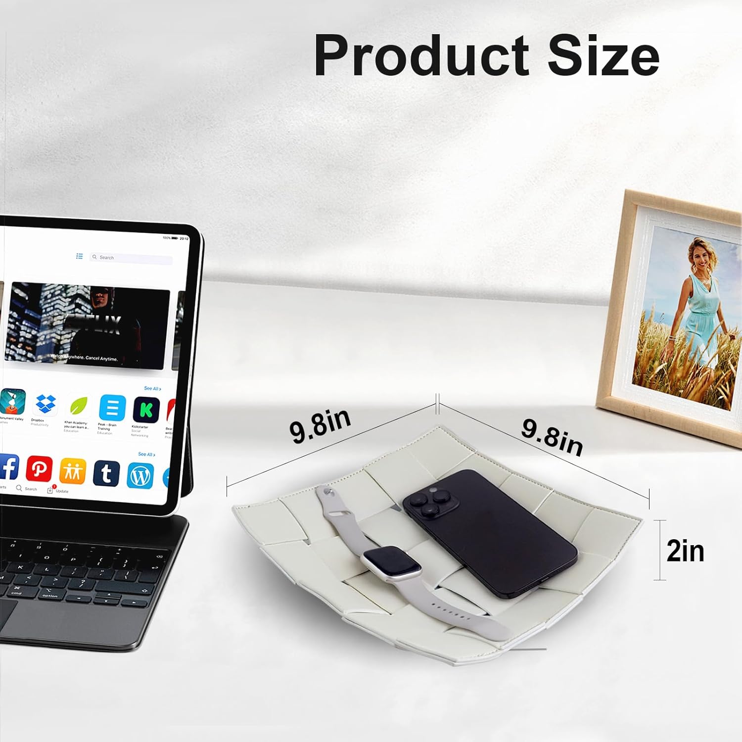 - SUITABLE SIZE - The size of the key bowl is 9.8"L x 9.8"W x 2"H, allowing you to place keys, jewelry, glasses, remote controls, bank cards, coins, EDC, candy and other items on the desktop, and keep your items neat and tidy.