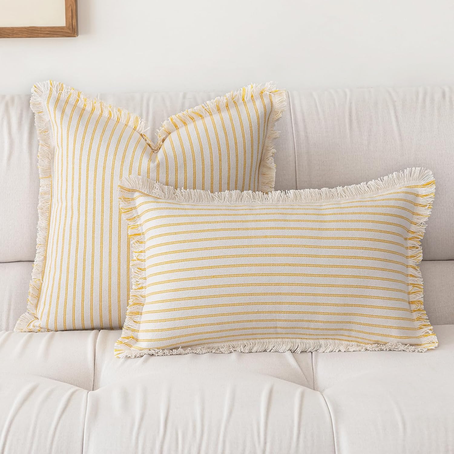 Throw Pillow Covers 22x22 Set of 2 Striped Fringe Pillow Cover Farmhouse Cushion Covers with Tassel Neutral Boho Pillows Decorative Square Pillowcase for Couch Sofa Bed, Yellow