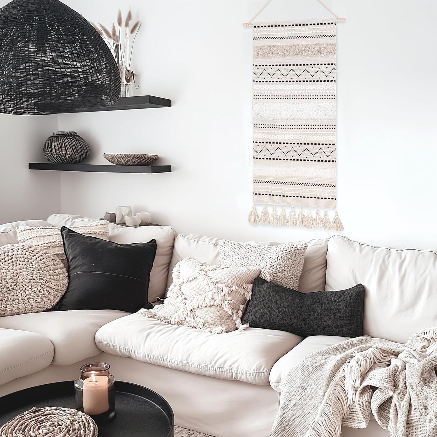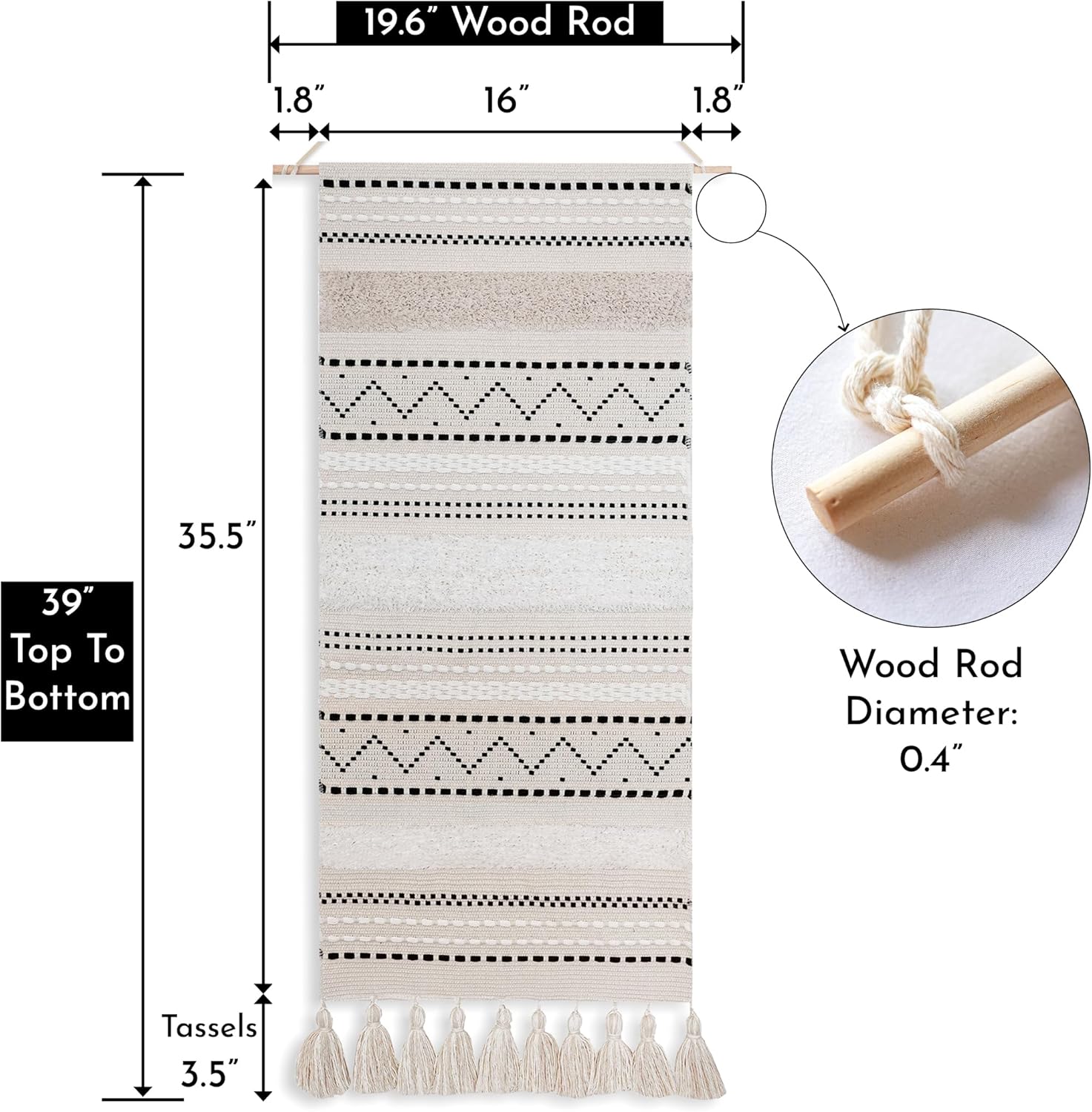 BlissBlush Long Vertical Wall Hanging Tapestry Woven Boho Farmhouse Decor Black Beige Cream Tassel Handmade Wall Art Decoration for Bedroom Living Room Dorm Nursery Apartment, 16x39 INCH