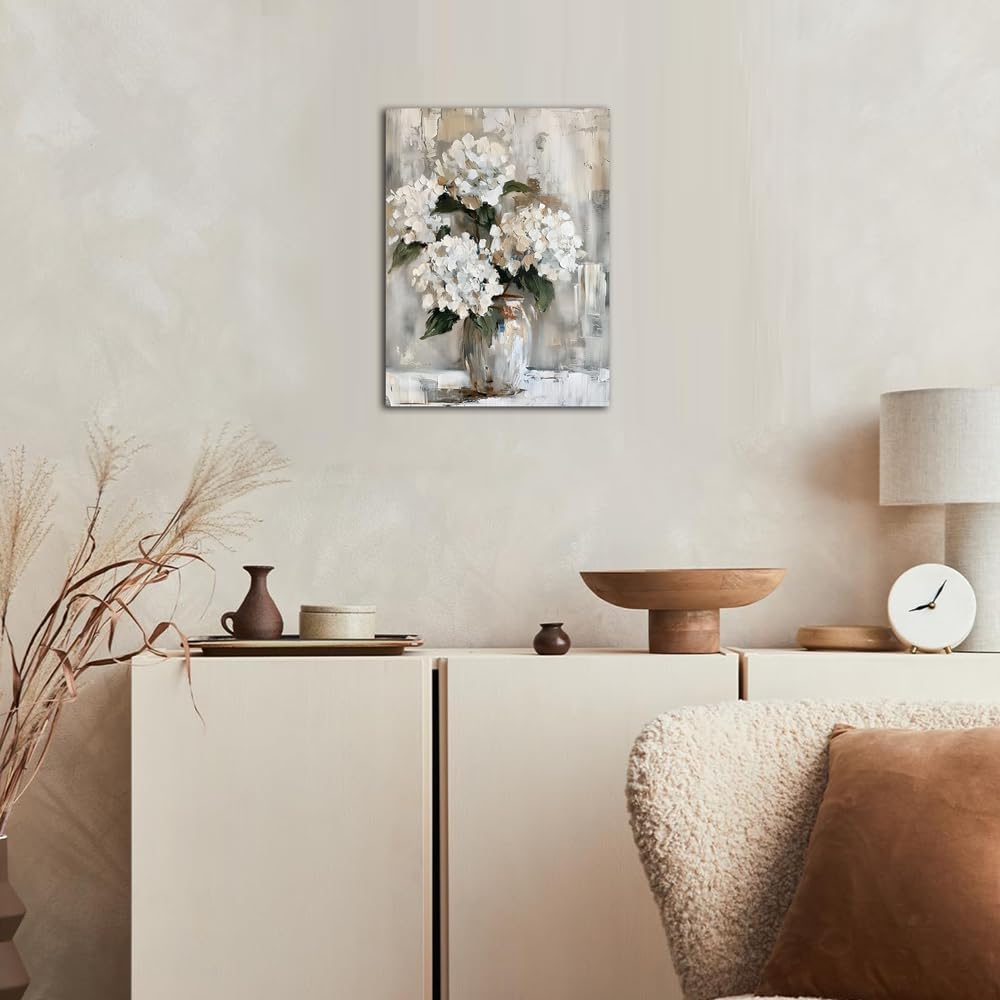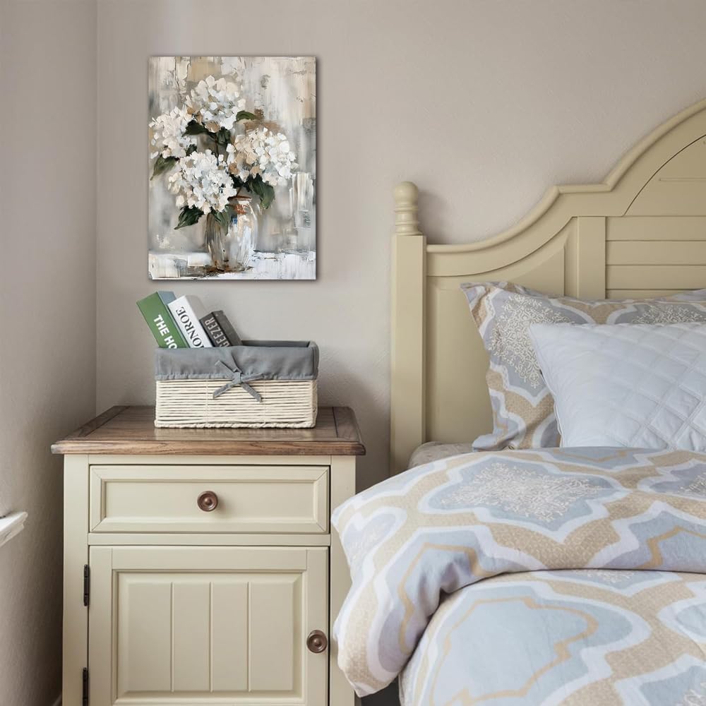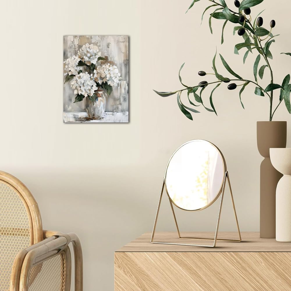 - White Hydrangea Canvas Wall Art Pictures, sized 12" x 15" (30cm x 38cm), is a small white blooming flower canvas wall art painting that comes with a canvas wrapped wooden frame and a hook, mounted and ready to hang. This retro flower landscape wall art view fits perfectly into cottage core decor, creating a feeling of calm and relaxation in your home interior decor scene.