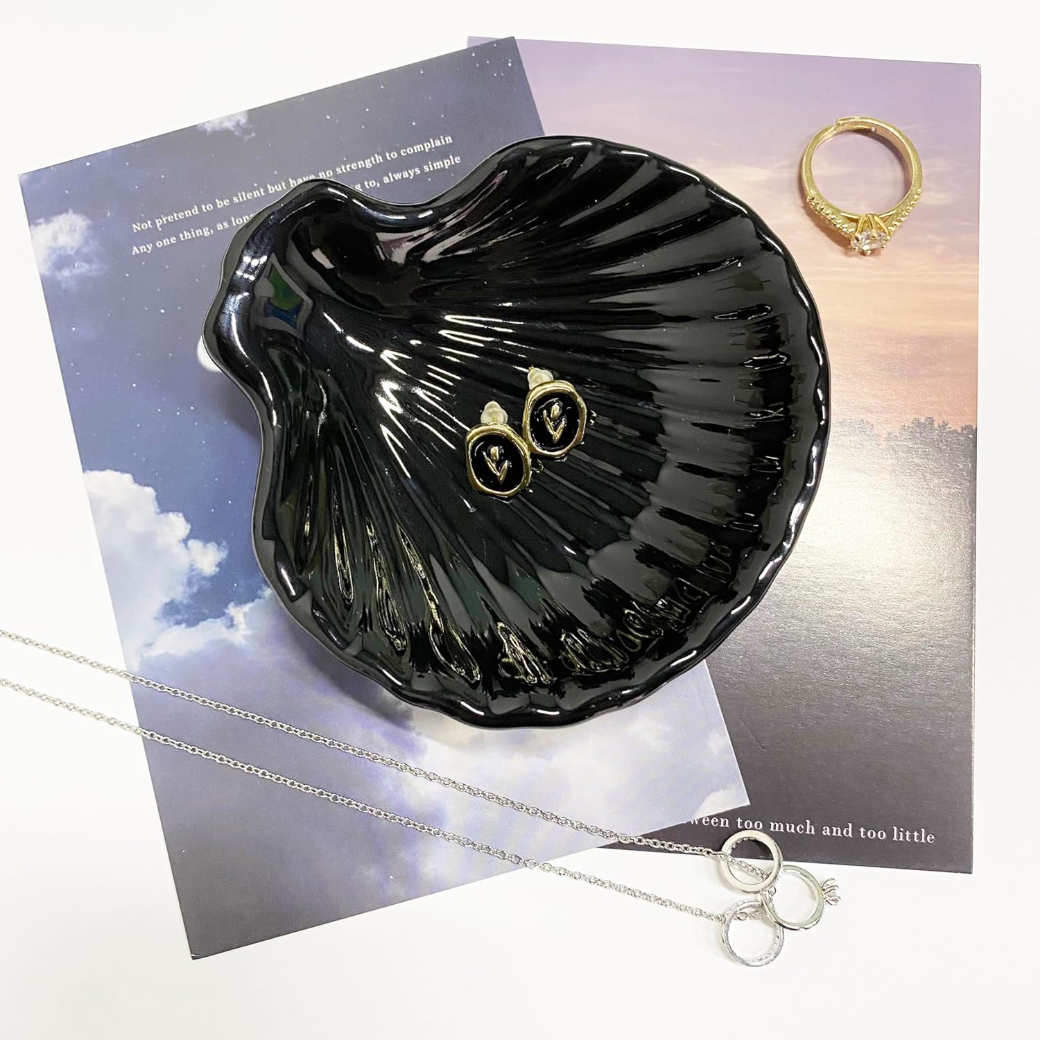 Shell Shape Ring Holder Dish, Seashell Jewelry Dish Tray, Ceramic Trinket Tray for Rings Earrings Necklaces Bracelet, Birthday for Mom Friend Sister, 3.9", Black