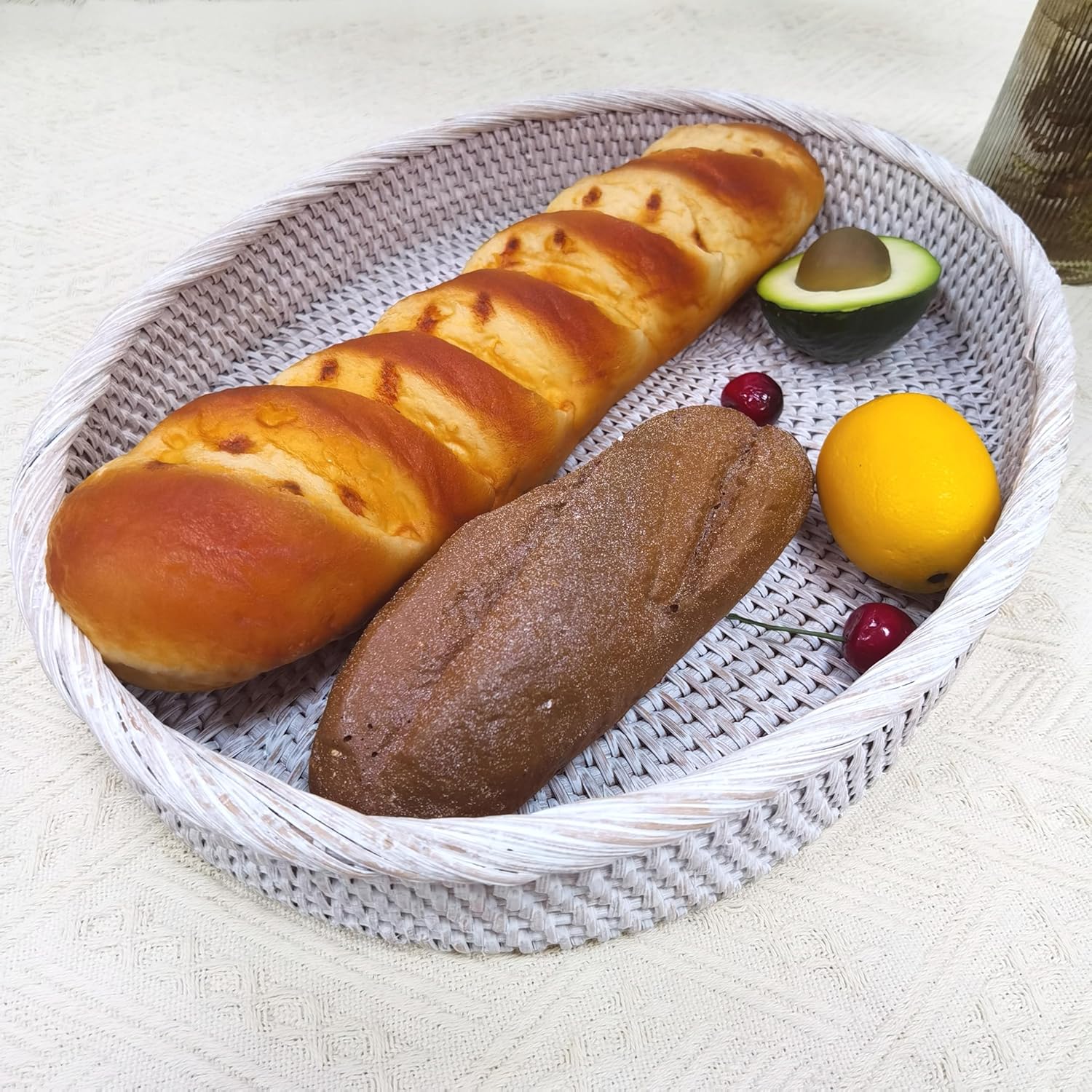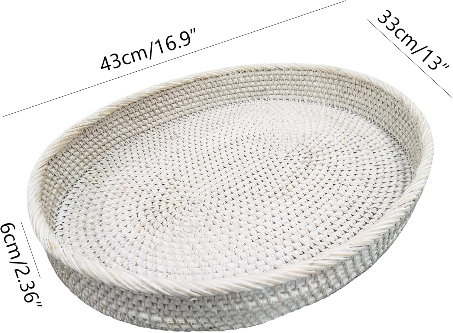 - ❤It is a Decorative Rattan Oval Serving Tray WITHOUT handles.The white storaging tray's dimensions is L43*W33*H6cm / L17"*W13"*H2.4".