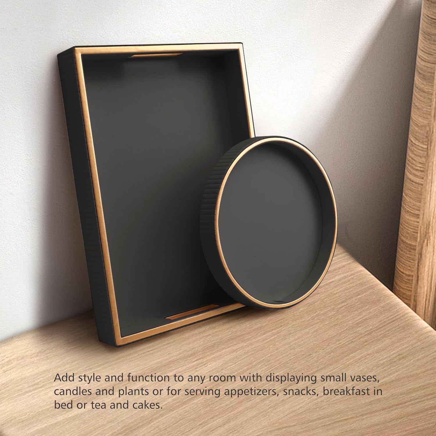 - 【Approximate Dimension】Rectangular tray, 15.3*11.2*2 inches. Round tray, diameter 10 inches, high 1.2 inches, making it a perfect size for storing small items.