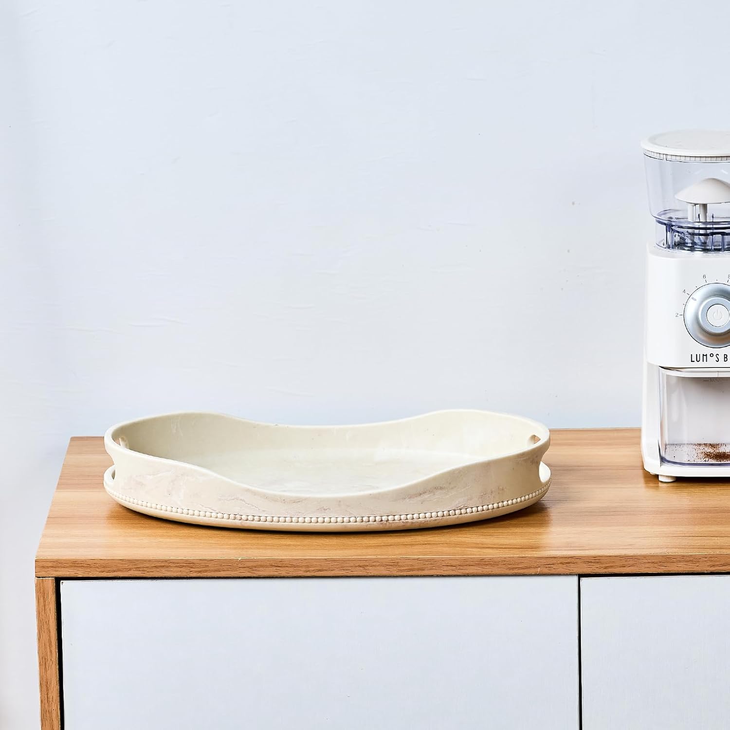 - Comfortable Design with Handles: With its sleek built-in handles, not only does it add aesthetic appeal, but it's also very easy to move around. There is a circle of beads on the bottom of the tray, which makes the tray look very elegant.