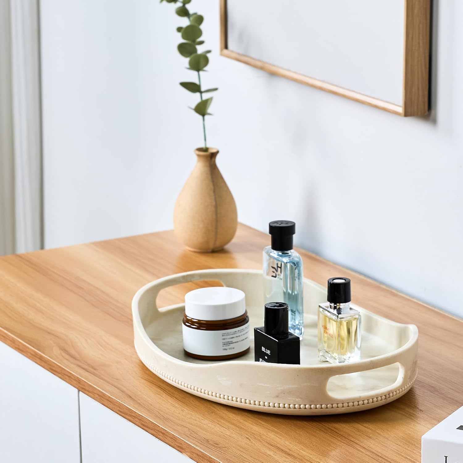 Beige Travertine Marble Serving Tray with Handles - 14x10 inches, Beaded Oval Decorative Tray, Countertop Ottoman Tray for Vanity, Living Room Entryway Table, Perfume Candle Display