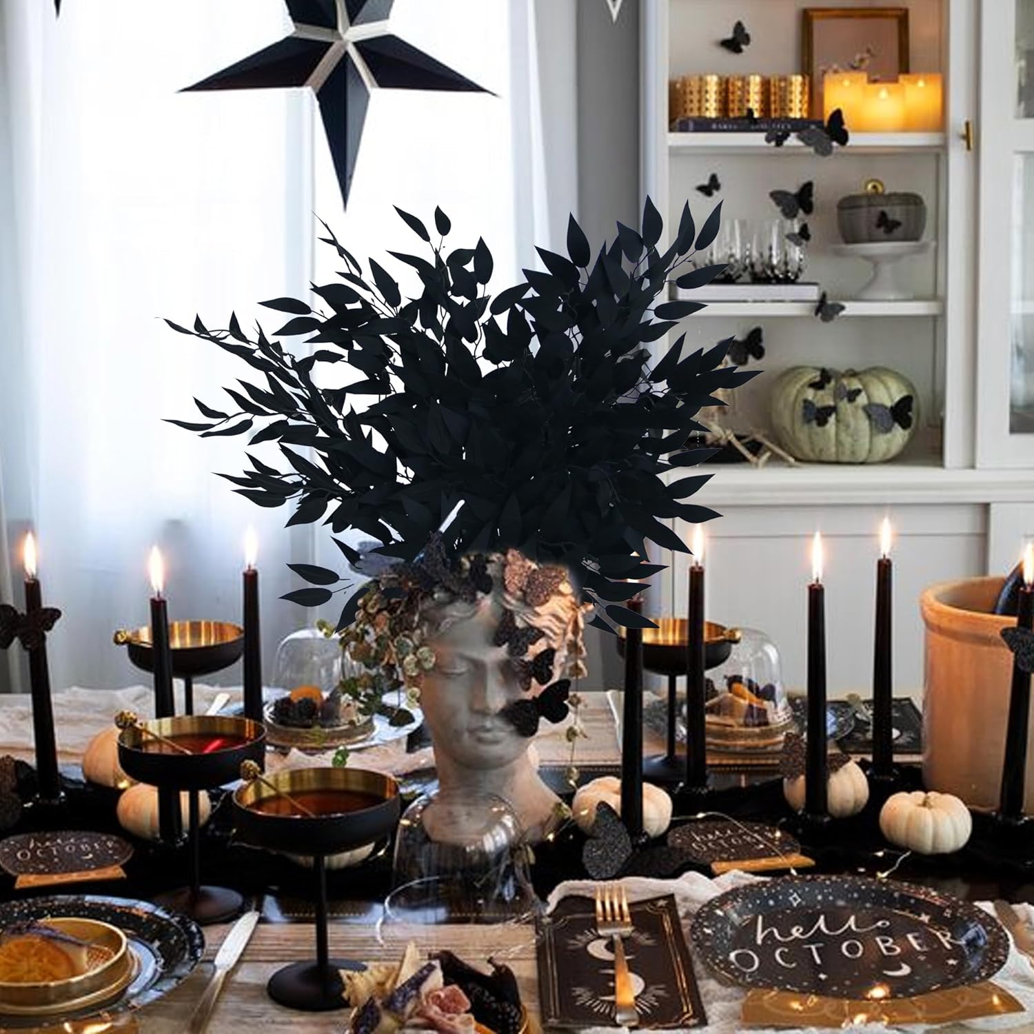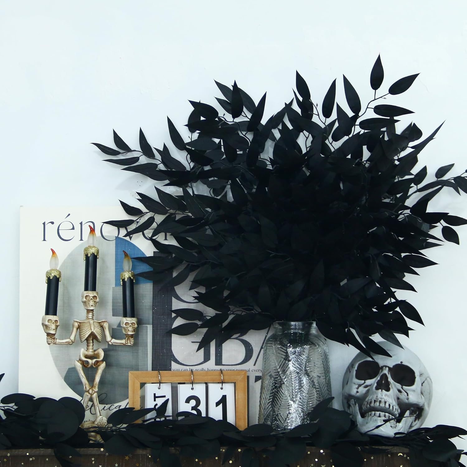 GREENTIME 6 Pack Artificial Black Italian Ruscus Stems 23.5'' Faux Halloween Leaf Bouquet for Vase Fireplace Table Centerpiece Decor