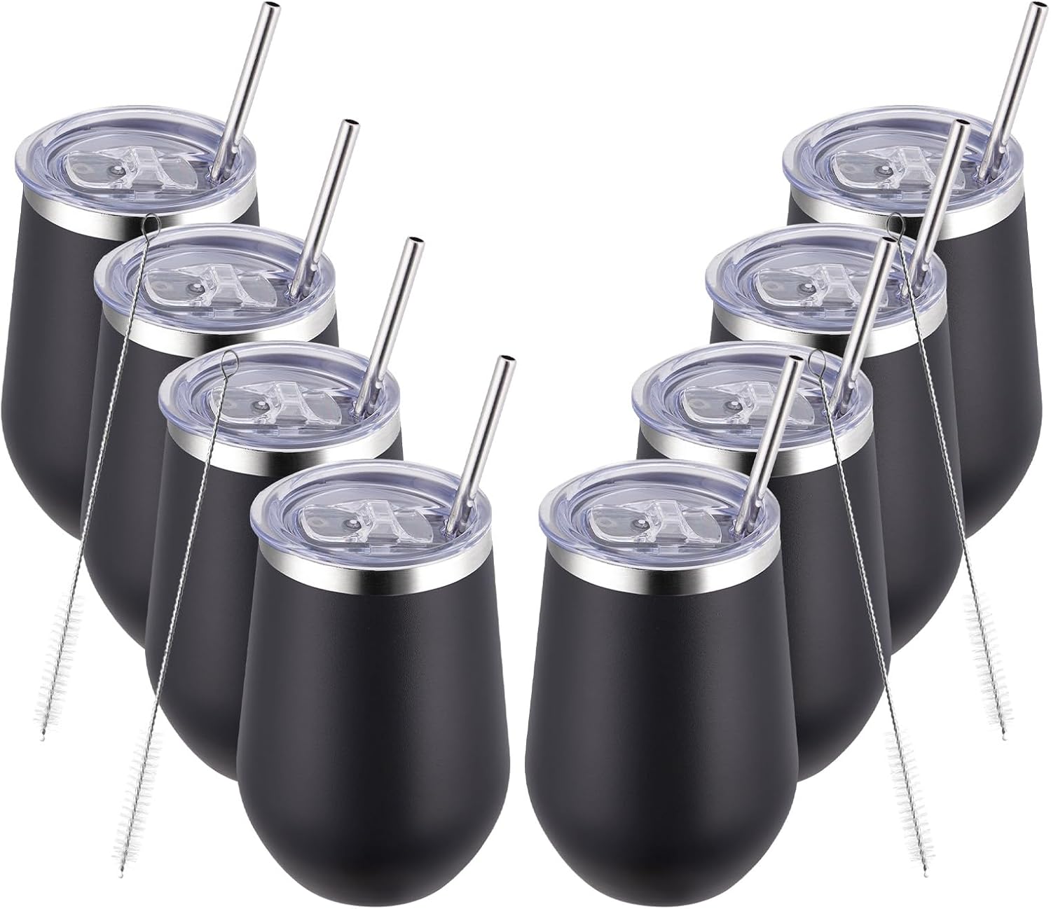 MEWAY 12oz Insulated Wine Tumbler with Press-In Lid, Double Wall Vacuum Stainless Steel Travel Tumbler with Straw,Travel Cup for Coffee and Drinks, Gift for Woman Under 10 dollars(Black,Set of 8)
