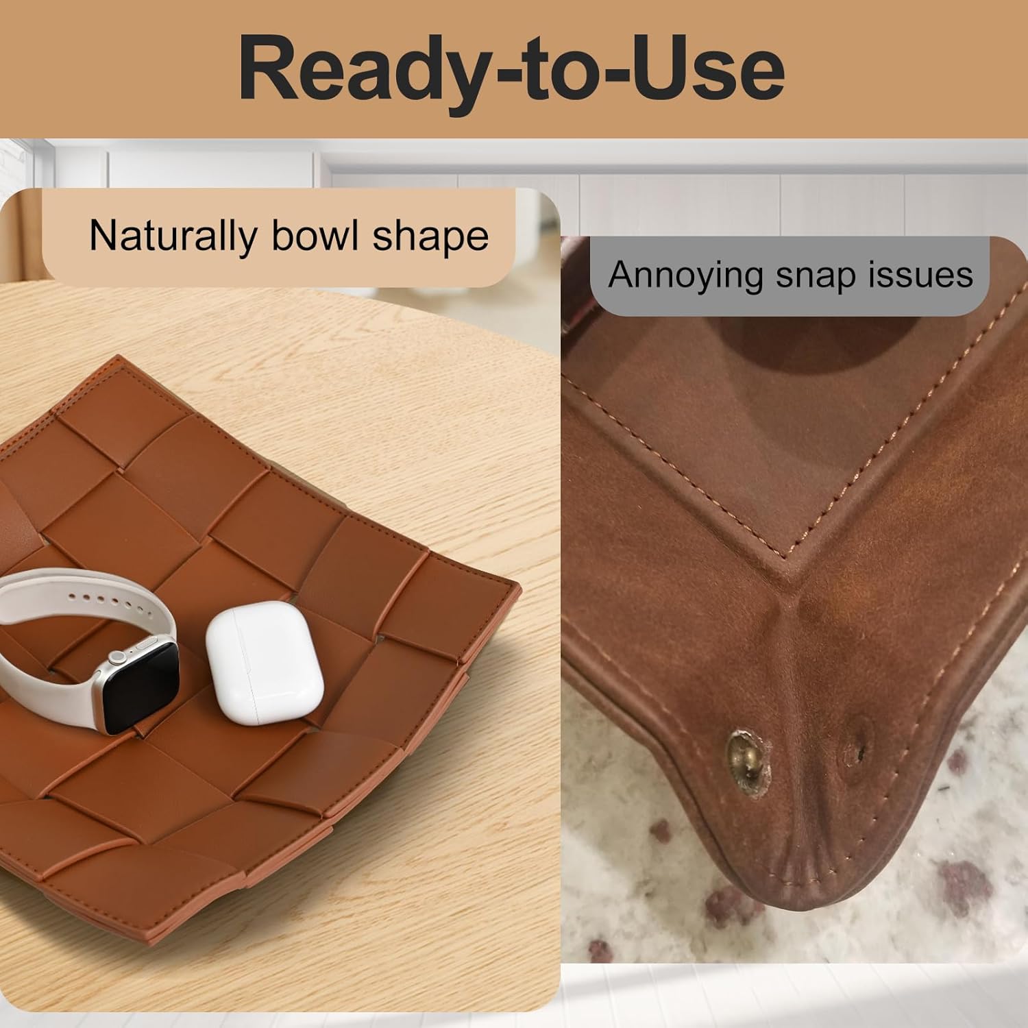 - LEATHER VALET TRAY FOR MEN - The desk organizer tray utilizes a square woven with a delicate double-sided design, it can be easily reversed between brown and black, making it like a 2-in-1. The catchall tray will be a classic decoration in the men's room.