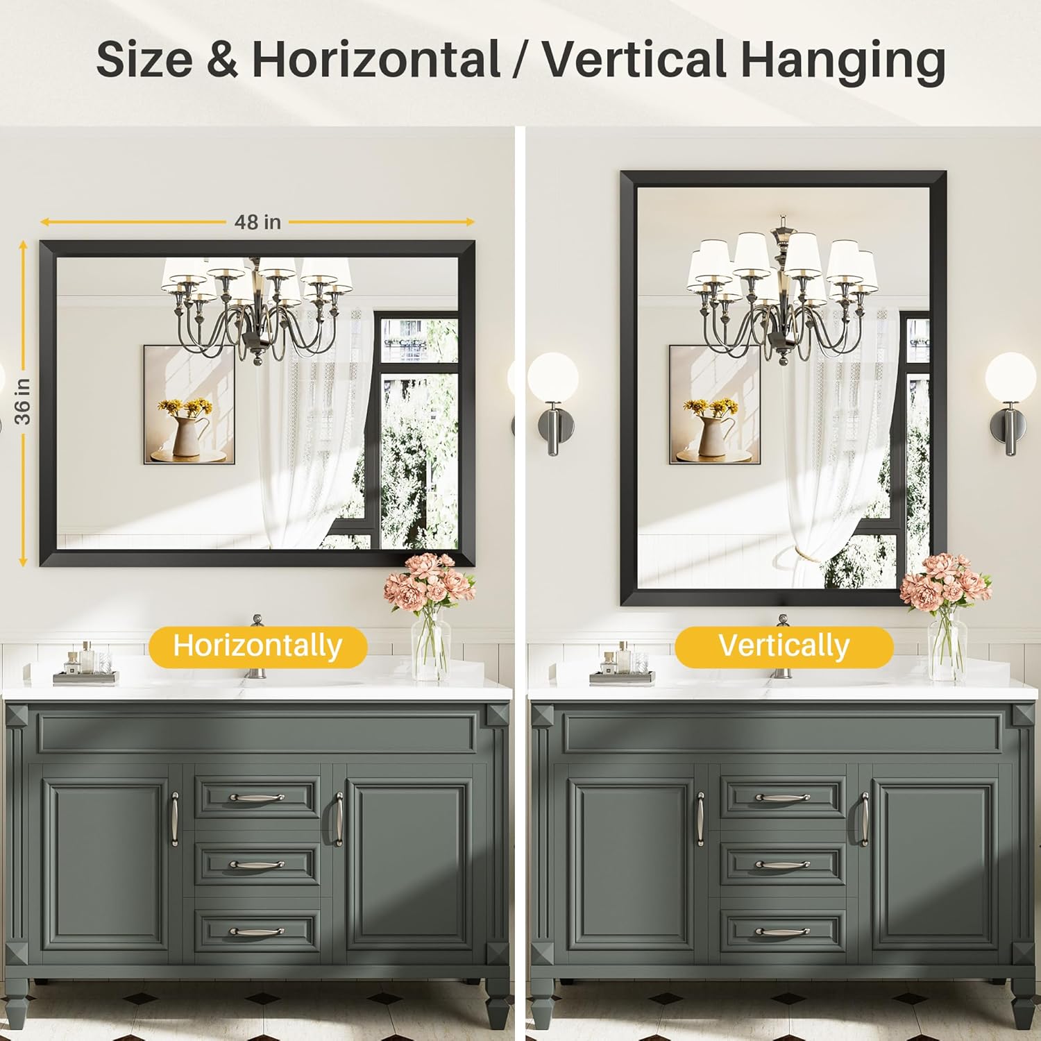 48x36 Inch Black Bathroom Mirror for Wall, Thick Metal Framed Rectangle Mirrors for Over Sink, Bedroom, Living Room, Entryway, Anti-Rust, HD Tempered Glass