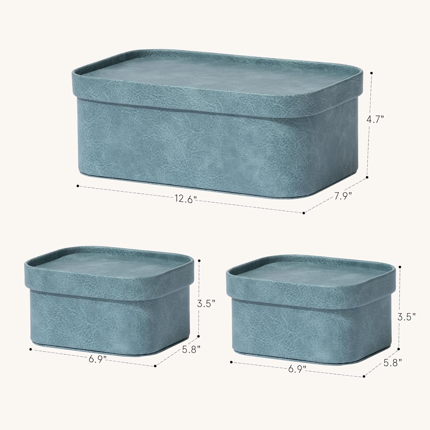 La Jolie Maison Vegan Leather Storage Boxes with Lids, Set of 3 Decorative Storage Containers Organize Stackable Storage Box, Dusty Blue