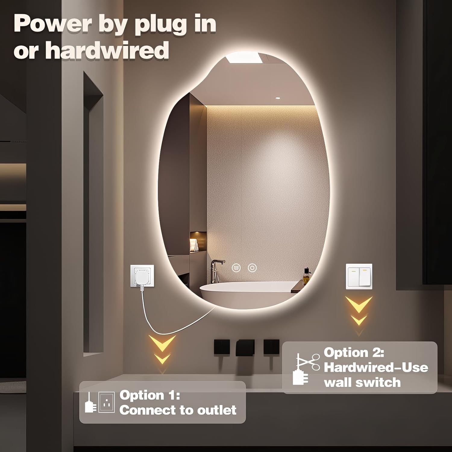 - 【Effortless Setup, Flexible Installation】 Enjoy professional results in minutes. Simply secure the included expansion screws to your wall and hang the irregular wall mirror. We offer flexible power options: use the standard plug or hardwire the cord directly to a wall switch for a seamless built-in look. The universal mounting system supports both horizontal and vertical orientation to fit your space perfectly.