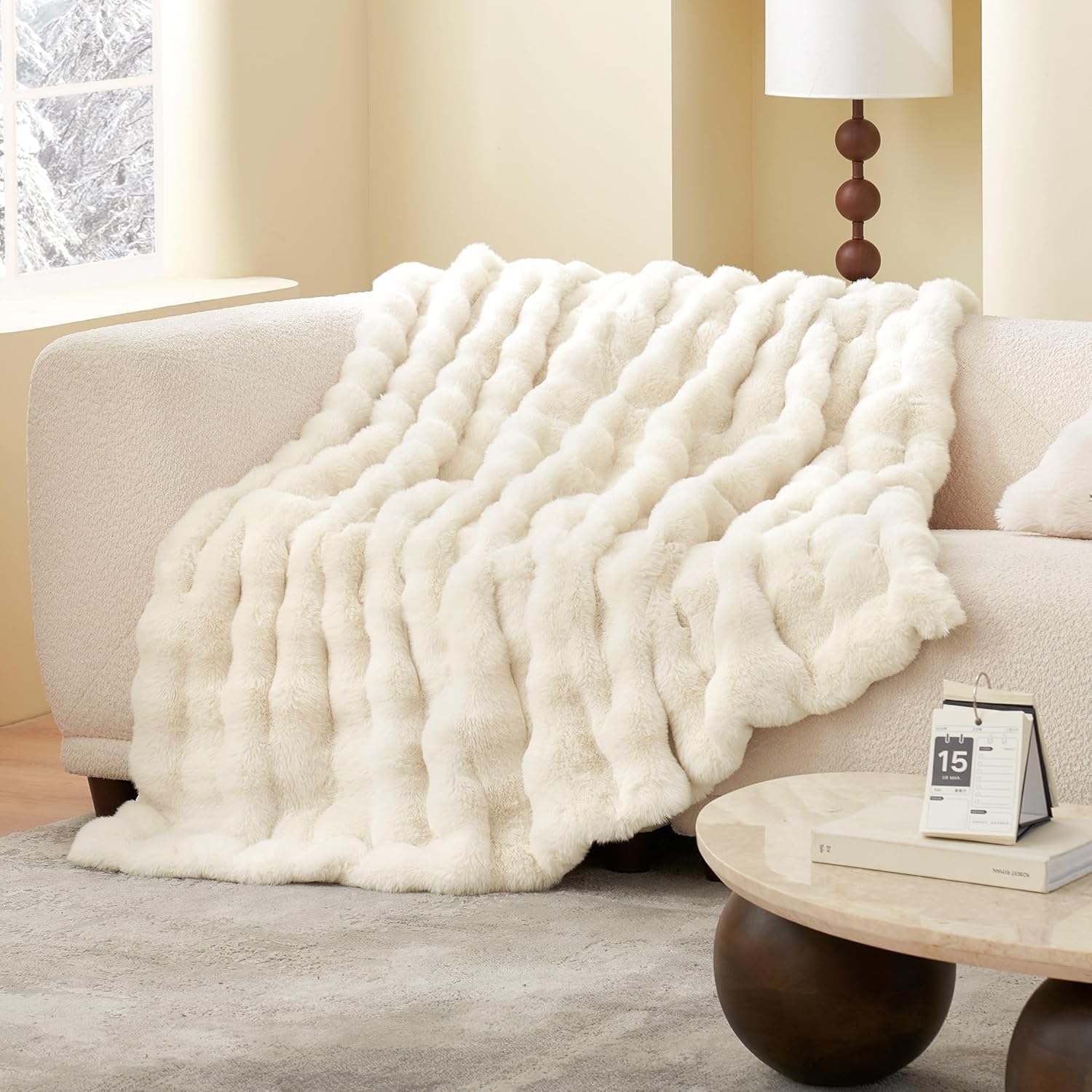 Amélie Home Faux Fur Throw Blanket for Bed, Ultra Soft Fuzzy Plush Bubble Blanket for Bedroom & Bed Decor, 108"x90", Cream White
