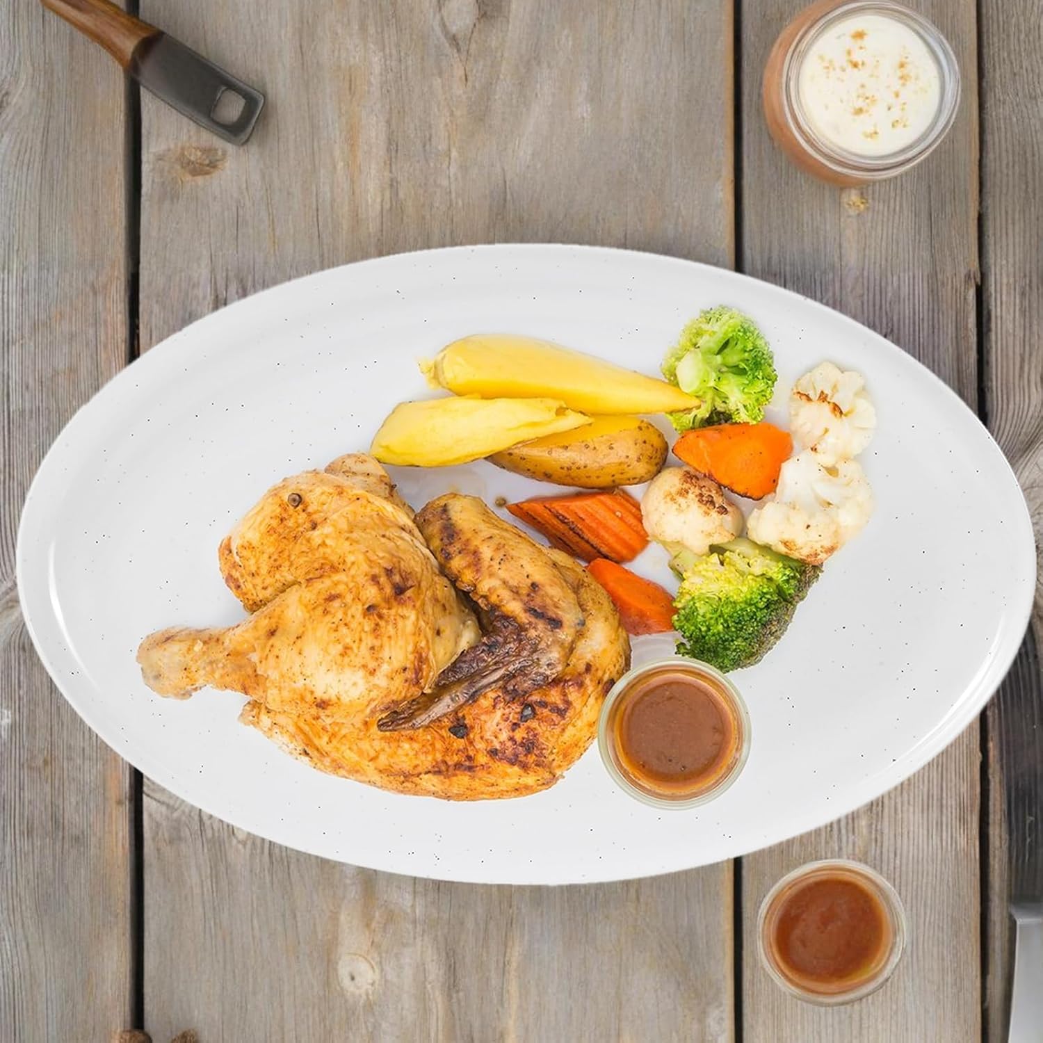- 【Two-Tone Modern Design】-This Oval Serving Platters features a classic white paired with a brown base, creating a striking contrast. The speckled pattern is evenly distributed, giving it a natural and understated elegance that complements any scenes.Non-slip edges & 1.1lbs lightweight design.