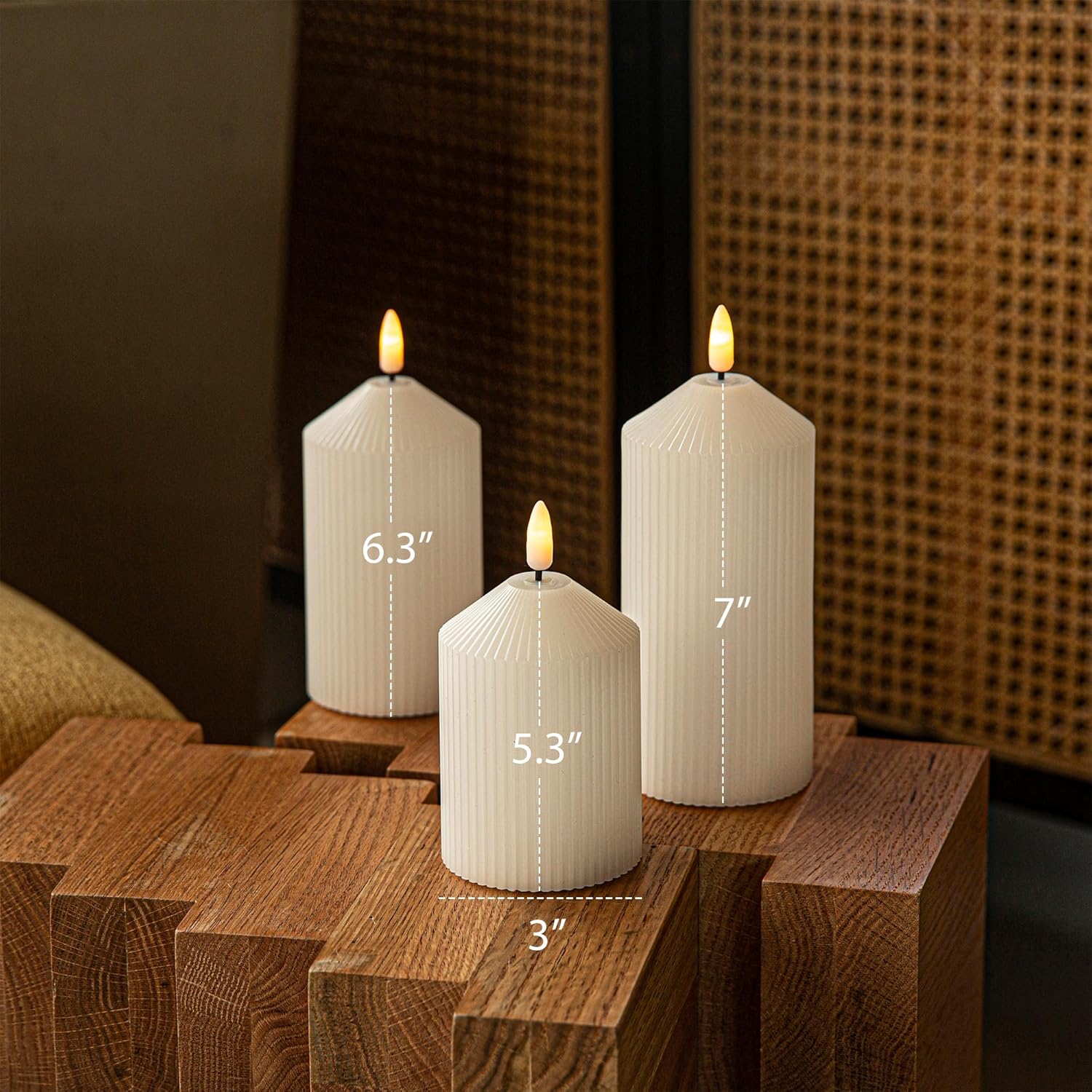 - 【Ultra-Realistic Flicker & Long-Lasting Glow – Mood-Enhancing Ambiance】True-to-Life Flickering Effect – Patented LED technology mimics natural candle movement. This decorative flameless candle set includes three real-wax LED candles (3" diameter) in graduated heights (5.3", 6.3", 7") to create staggered elegance in any place like coffee tables, kitchen countertops, dining tables, office desks, bookshelves, fireplace mantels, or entryway consoles.