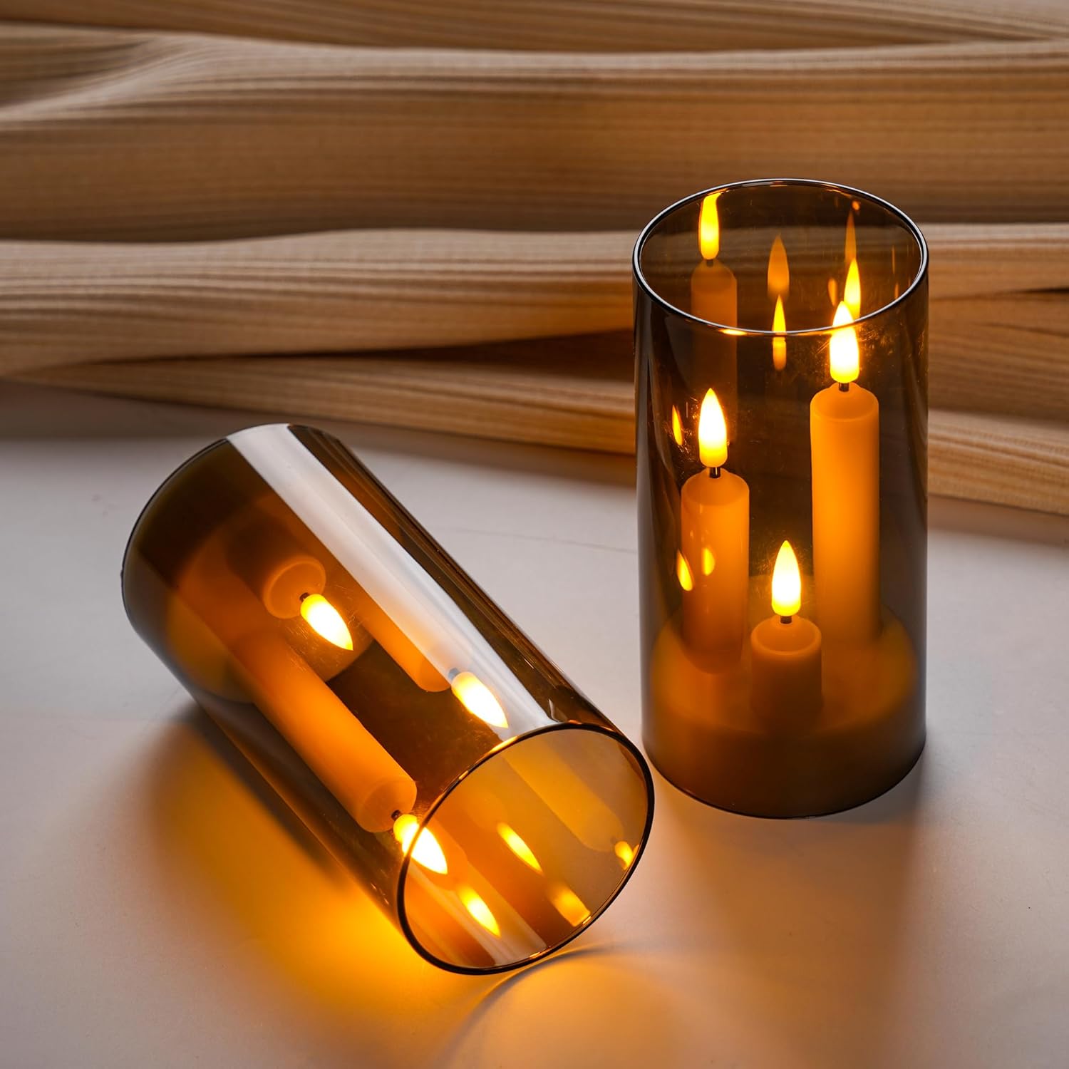 - REALISTIC DESIGN: Three-wick LED pillar candles with flickering flame effect and smoky grey glass holders create an authentic candlelit ambiance