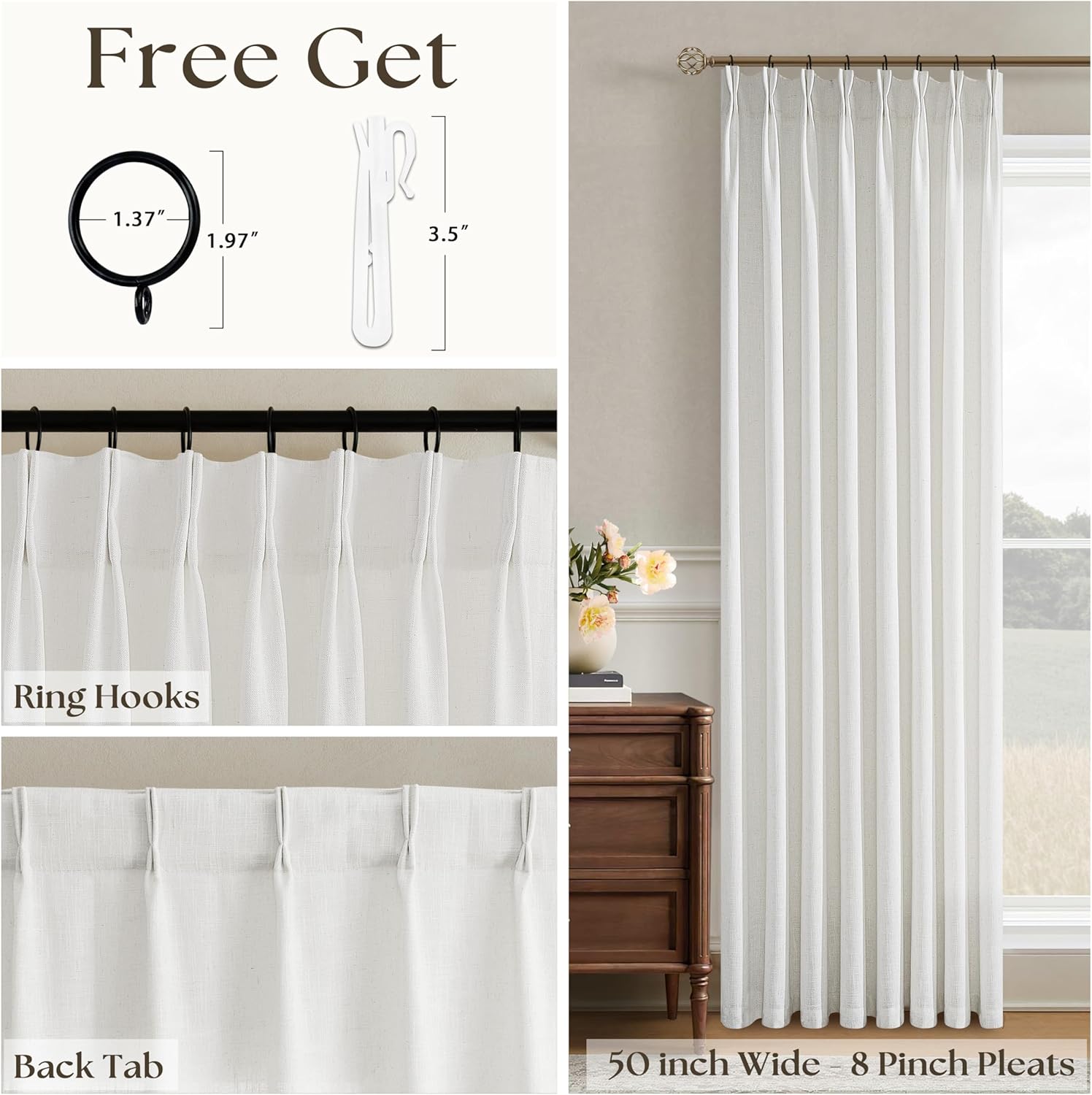 Pinch Pleated Linen Curtains 84 Inch Length for Living Room Bedroom Textured Ivory Birch Semi Sheer Boho Neutral Back Tab Pinch Pleat Hooks Rings Window Curtain 84 Inches Long 1 Panel Beige White
