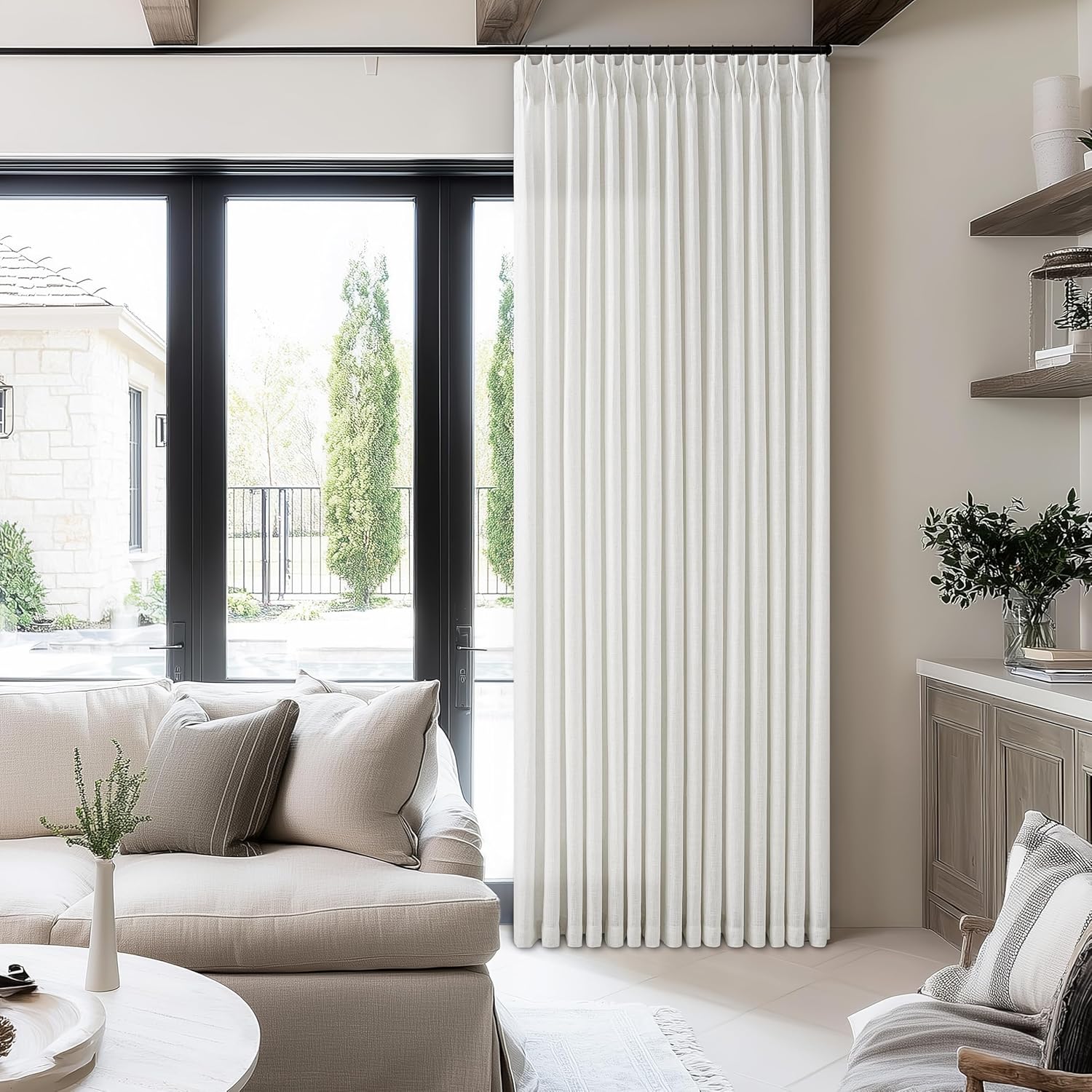 Pinch Pleated Extra Wide Linen Curtains 84 Inches Long for Patio Sliding Glass Door 60 Inch Wide Pleated Drapes with Hooks Rings Neutral Semi Sheer 60x84 Curtain for Living Room 1 Panel Ivory Birch