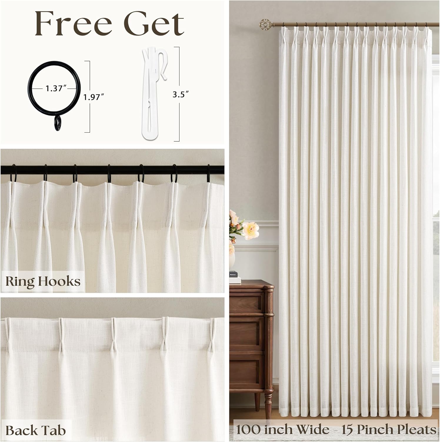Extra Wide 100 Inch Width Curtains 96 Inches Long Pinch Pleated for Patio Sliding Door Light Filtering Semi Sheer Linen Drapes Back Tab Cream Ivory Extra Wide 100 x 96 Curtain for Living Dining Room