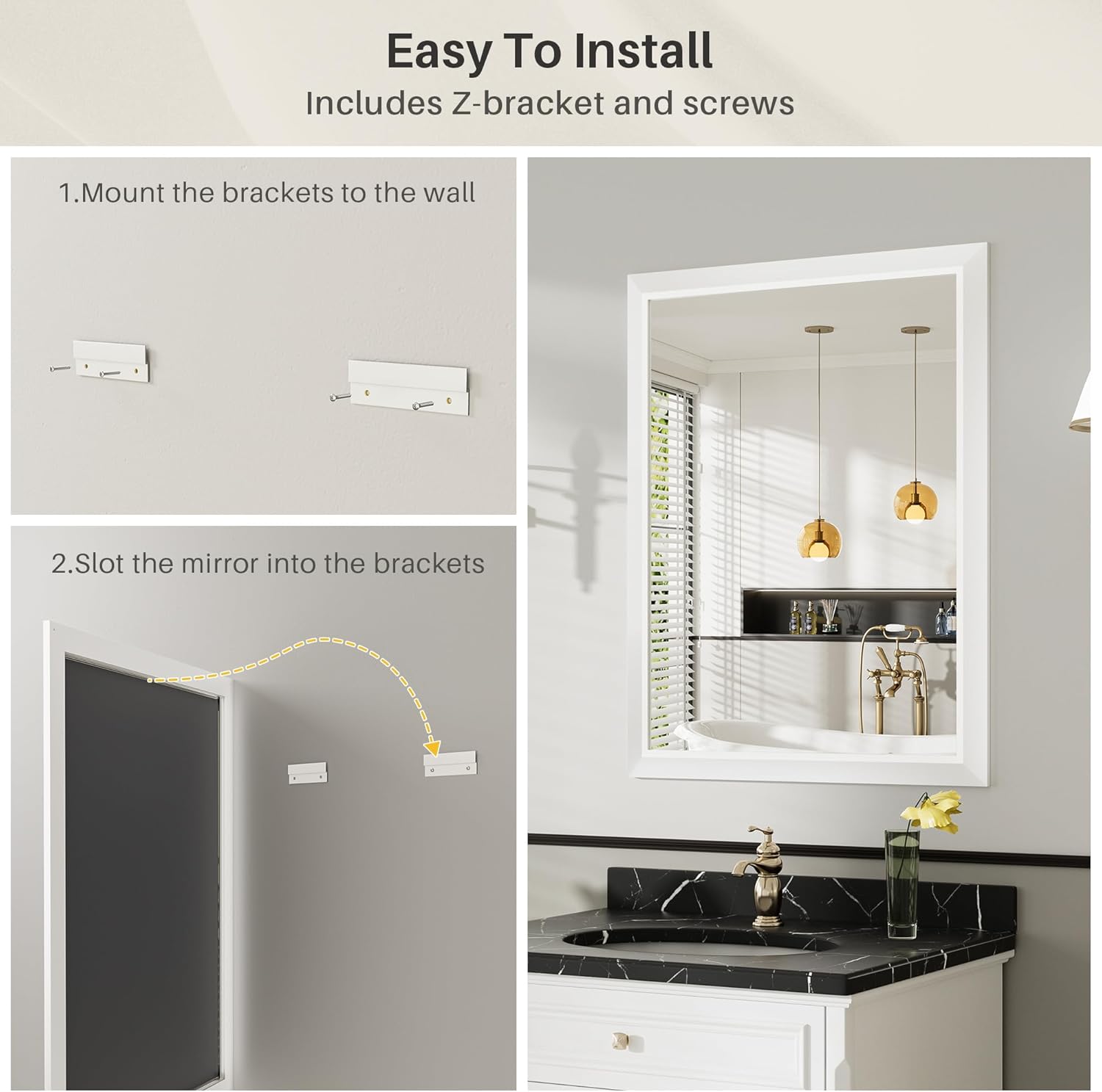 - 【Easy to Install: The modernized mirror comes with two Z-bar wall brackets, it's easy to install the mirror and you can choose to hang the mirror vertically or horizontally depending on the specifications of your bathroom. The bracket is sturdy enough to support the weight of the mirror.