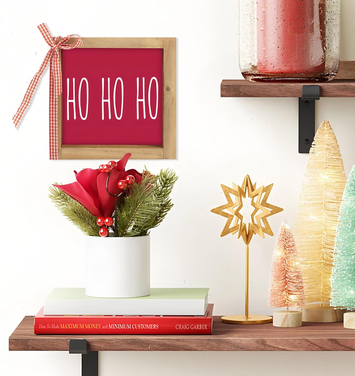 - Festive ho ho ho design: Eye-catching white “Ho Ho Ho Ho” lettering on a vibrant red background with charming red and white checkered ribbon for a cheerful holiday atmosphere