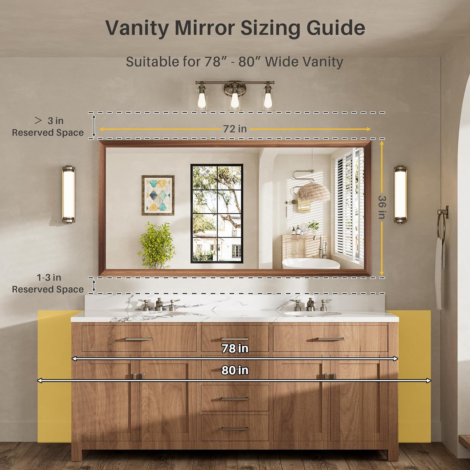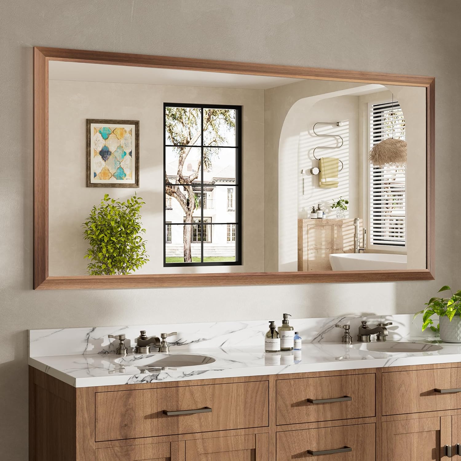 - Elegant & Durable Metal Framed Mirror : Our beveled frame artfully fuses walnut wood grain with aluminum alloy, crafting a classic rustic aesthetic. Both beautiful and functional, it resists rust and bending. Its elegant design suits any decor, enhancing your space’s charm.