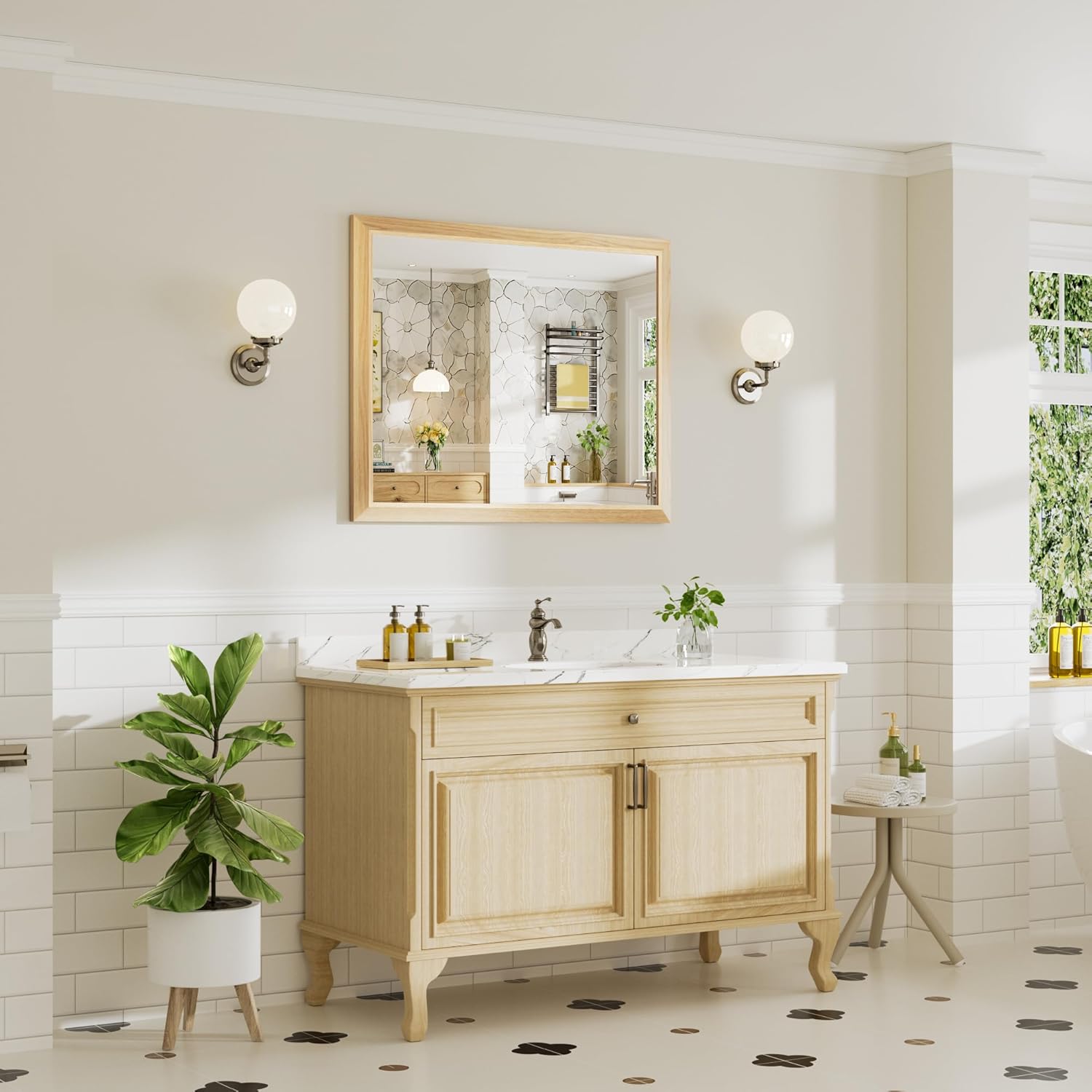 - Elegant & Durable Metal Framed Mirror : Our beveled frame artfully fuses oak wood grain with aluminum alloy, crafting a classic rustic aesthetic. Both beautiful and functional, it resists rust and bending. Its elegant design suits any decor, enhancing your space’s charm.