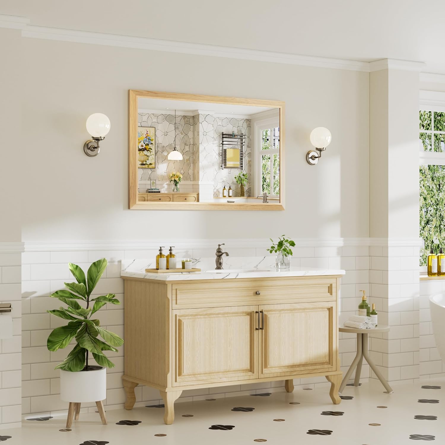 - Elegant & Durable Metal Framed Mirror : Our beveled frame artfully fuses oak wood grain with aluminum alloy, crafting a classic rustic aesthetic. Both beautiful and functional, it resists rust and bending. Its elegant design suits any decor, enhancing your space’s charm.