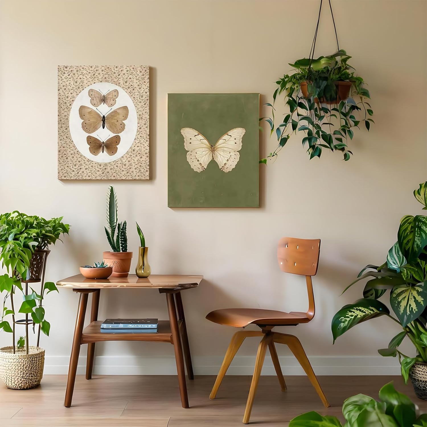 - Design – Delicate Botanical Details: Includes two complementary prints: one highlighting a single white butterfly on a muted green background, and the other showcasing three butterflies arranged on a floral beige backdrop.
